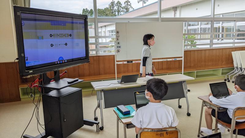 子どもたちは、昨年導入された1人1台端末(Chromebook、クロームブック)を使って学びを深めています。タブレット用学習ソフト「ミライシード」を活用しています。子どもたちは、先生から送られたカードに自分の考えをまとめ、担任の先生の端末に無線送信します。あとは大型モニターに投影されたカードを使って話し合い、学びを深めます。