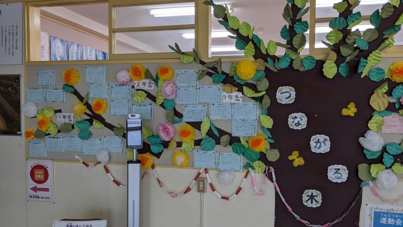 児童玄関にある「つながる木」の掲示物です。子どもたち一人一人が運動会の目標をカードに書き貼っています。子どもたちはそれぞれの目標に向かってがんばっています。
