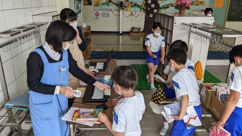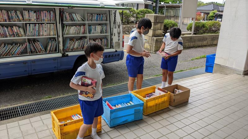 町の移動図書館、わかば号(Ⅱ世)がやってきました。図書室にない本もあるので子どもたちは楽しみにしています。