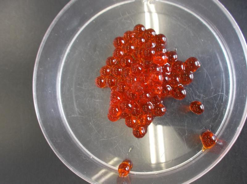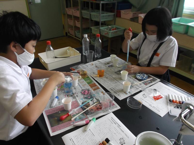 絵の具で好きな色に着色しました。駒込ピペットで2つの液体を合わせると・・・イクラが!