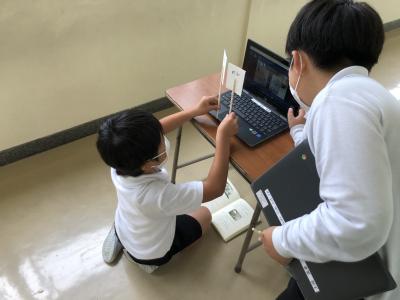 外国語の授業で、5年生は6年生に地域の身近な人をパソコンを使いながら紹介しました。