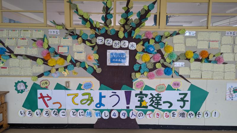 夏休みが終わり、児童玄関の「つながる木」がリニューアルしました。今回のめあては「マラソン大会にむけて」です。来週の授業参観でご覧ください。