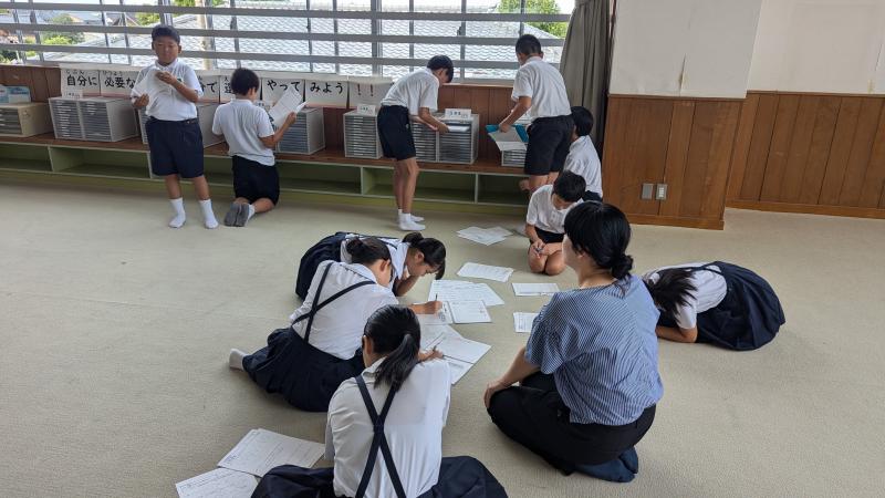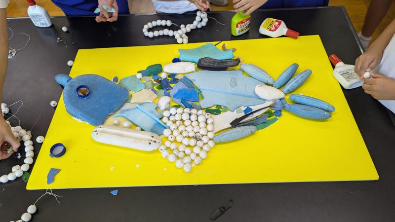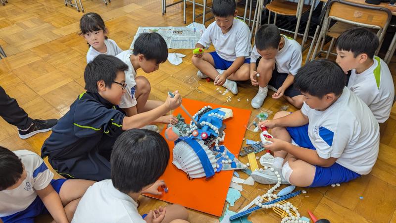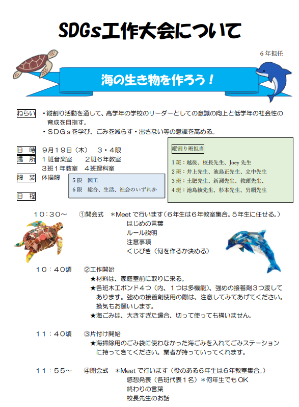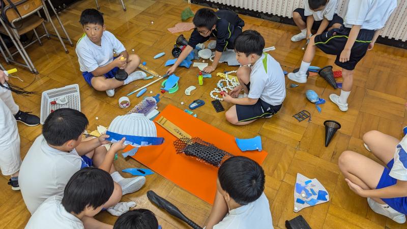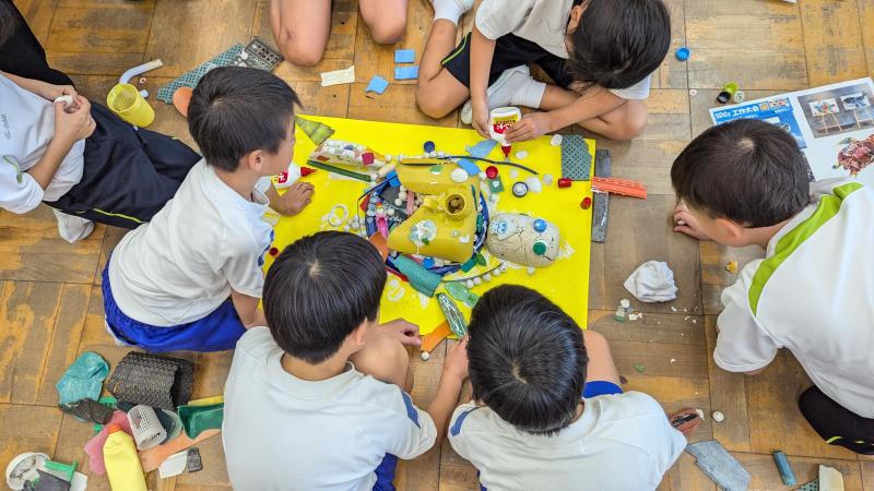 6月に実施した「クリーン大作戦IN今浜海岸」で集めた海洋ゴミを使って、縦割り班ごとに海の生き物の工作大会を行いました。それぞれ工夫した作品を完成させることができました。最後の感想では、私たちの「宝」である今浜海岸を守りたいという気持ちが高まったことを発表してくれました。