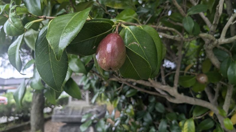 答えは、「ツバキ(椿)」です。この実の中にある種を乾燥させて搾れば「ツバキ油」を取ることができます。