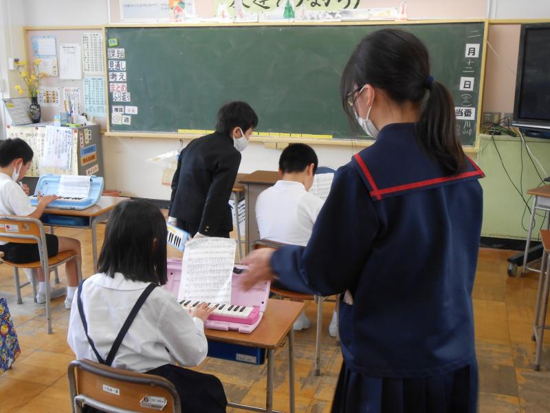 4年生の中で,今年度と同じ鍵盤ハーモニカ担当の児童は6人です。3年生に校歌の演奏の仕方や指づかいを丁寧に教える姿が見られました。