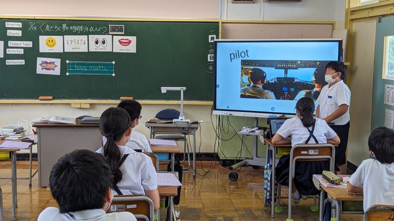 1学期のJoeyさんとの外国語の授業もあと少しとなりました。今日は5年生が、将来の夢に合わせて、「My dream schedule」を紹介し合う活動をしていました。話す側もきく側も英語を積極的に使う姿が見られました。