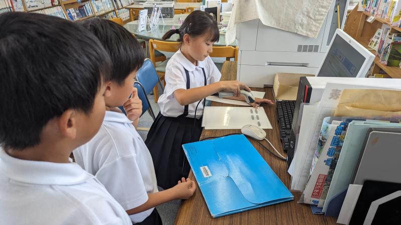 4年生になると、高学年の仲間入り。委員会活動やクラブ活動を5・6年生といっしょに行います。ときには、4年生だけでやらなくてはならないこともあります。この日は4年生の図書委員が貸出の仕事を一人でやってくれていました。頼もしい姿ですね。
