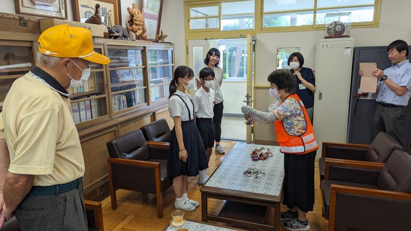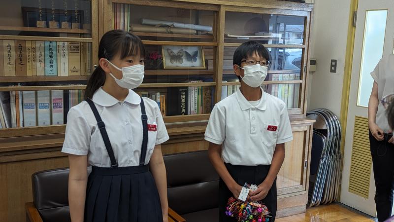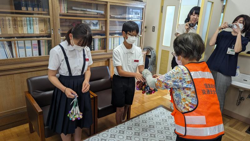 交通安全協会母の会から、心のこもった手作りの「交通安全マスコットキーホルダー」を頂きました。児童2名が児童代表として、校長室で受け取りました。