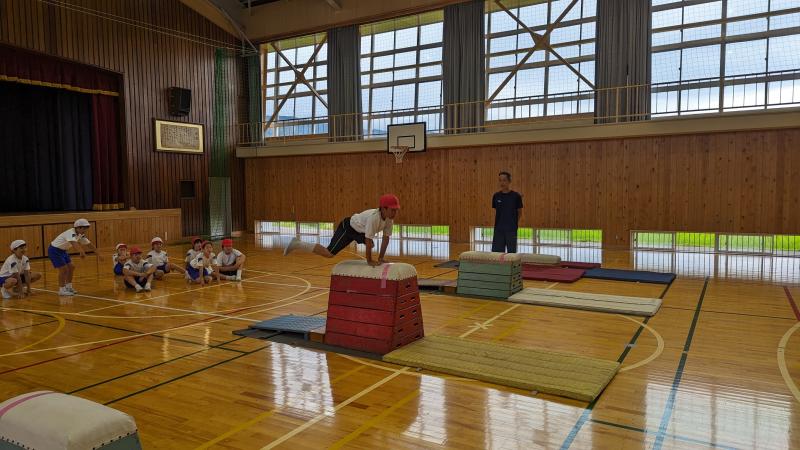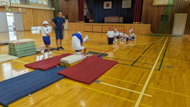 2学期の器械運動交歓会に向けて、4年生が「跳び箱」の練習を頑張っています。「開脚跳び」や「閉脚跳び」「台上前転」を練習していました。