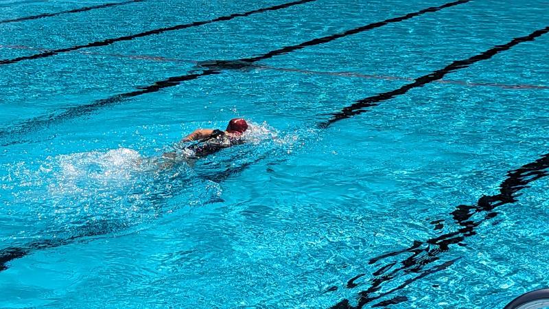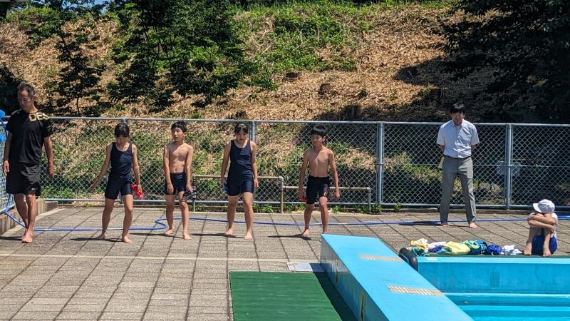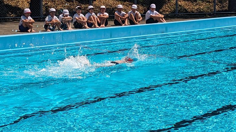 プール掃除は随分前に終わっていたのですが、今日ようやくプール開きを行うことができました。5・6年生4名が模範泳法を行いました。
