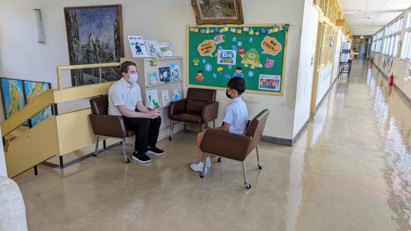 高学年の英語の授業では、学習したことを使って、英語のコミュニケーションができるかどうかテスト(パフォーマンステスト)を行っています。写真は、ALTのJoeyさんから英語で質問され、それに英語で答えている児童の様子です。
