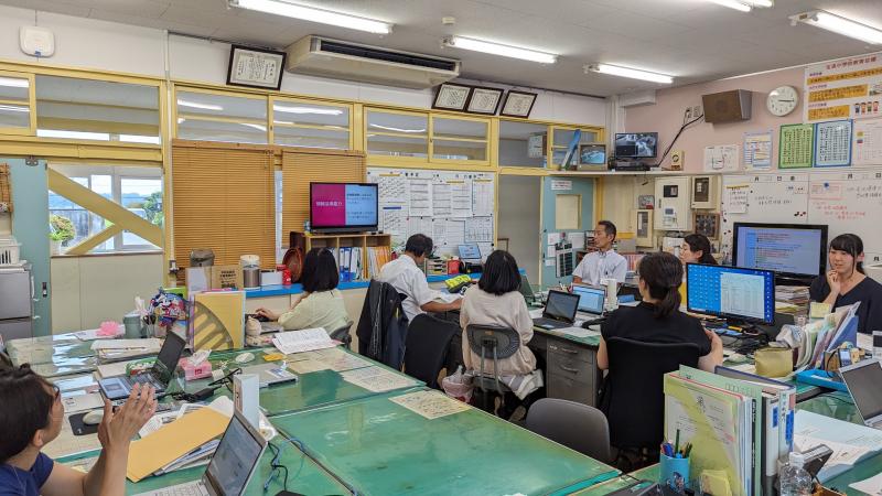 先生たちも定期的に校内OJTという研修会(勉強会)を行っています。この日は、GIGAスクール構想に係るICTの活用等について、先生たちの日頃の実践について紹介し合いました。会の進行は、GIGA推進リーダーの池島先生です。