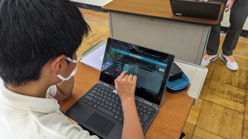 教科以外の活動でもプログラミングの学習に取り組んでいます。今日のプログラミングクラブでは、プログラミングの学習サイト「Hour of Code(アワー・オブ・コード)」でプログラミングに取り組んでいました。ゲーム感覚で活動できるところが魅力的です。また、下の6年生のように、言語を「英語」にすることで、英語の学習にも繋がります。