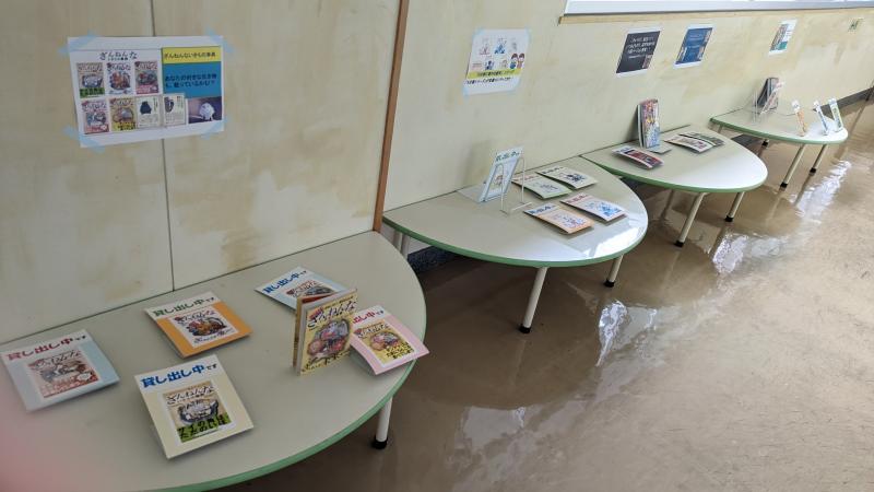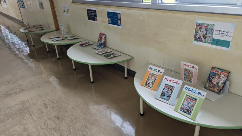学校図書館前の廊下に人気図書の紹介コーナーがあります。用務員の越野さんが作ってくださいました。ありがとうございます。人気の高い図書は「貸出中」のカードが変わりにおいてあり、貸出可能かどうか一目瞭然でわかります。