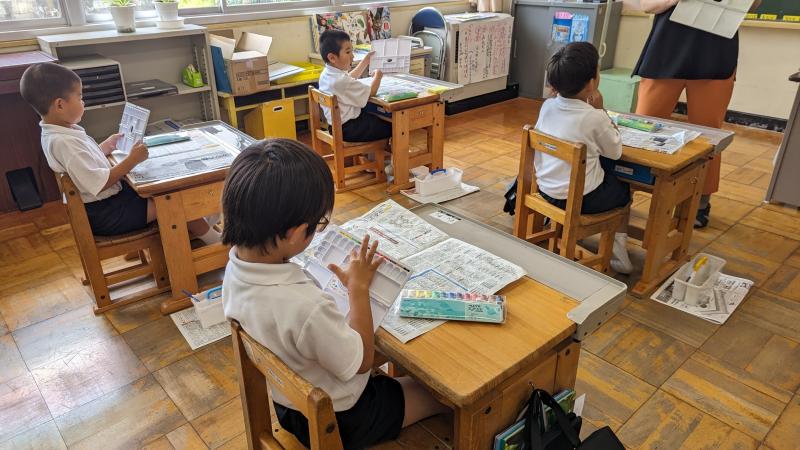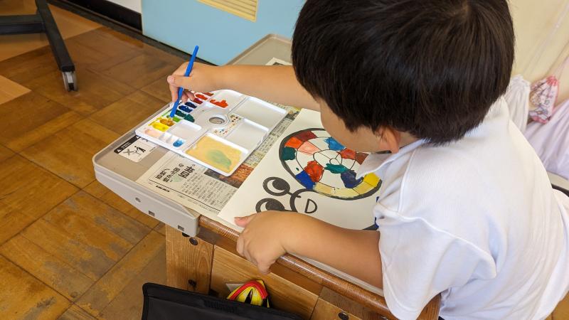 1年生もいよいよ絵の具を使った勉強がスタートします。今日は、絵の具セットの使い方を習ったり、実際に色を塗ってみたりしました。