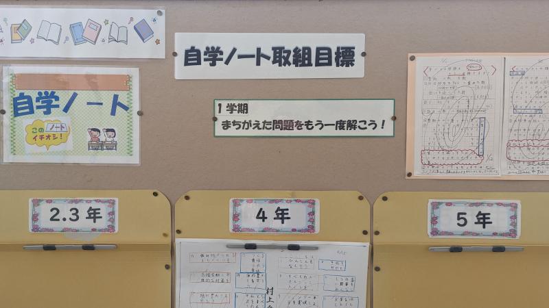 今年度も子どもたちは家庭学習で自学ノートに取り組んでいます。1学期は、「まちがえた問題をもう一度解こう!」が課題です。お手本となるノートを掲示して、他の児童に広めるようにしています。