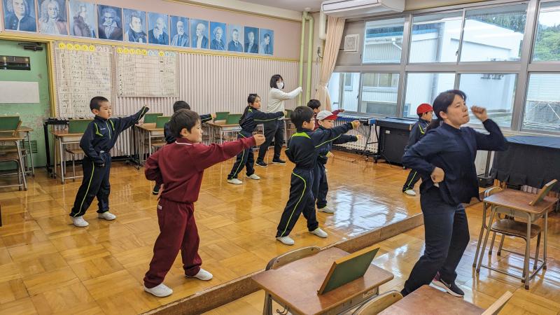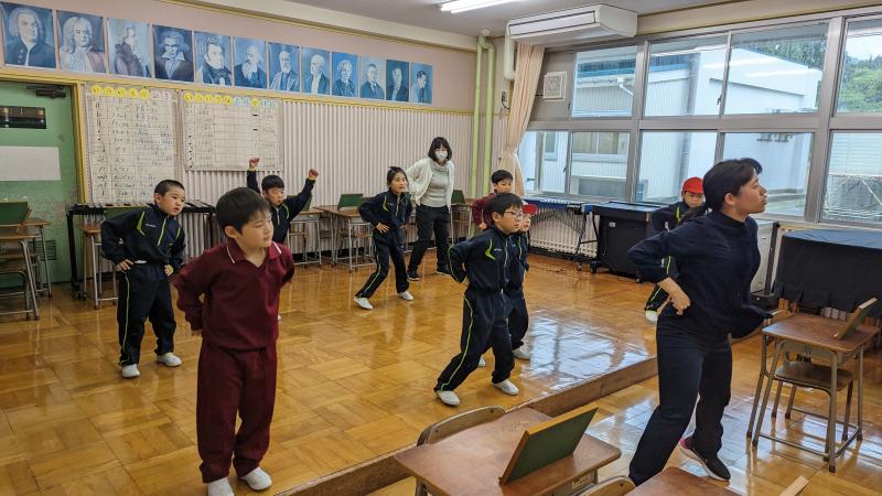 昨年度の低学年のダンスは「おそ松さん」でした。ダンスが得意な井上先生の指導で、1年とそよかぜ学級の子どもたちが練習していました。今年の曲は何かな?当日をお楽しみに!