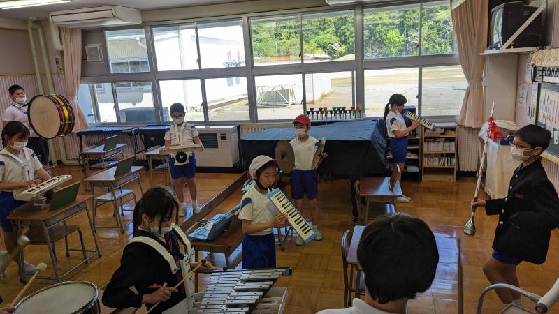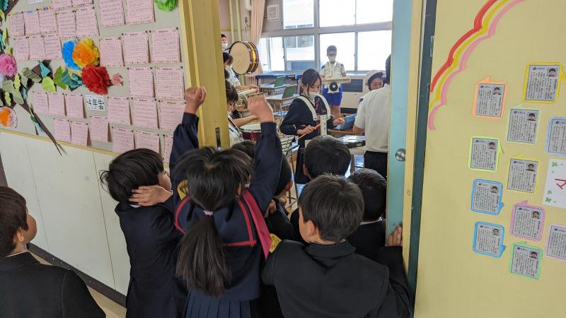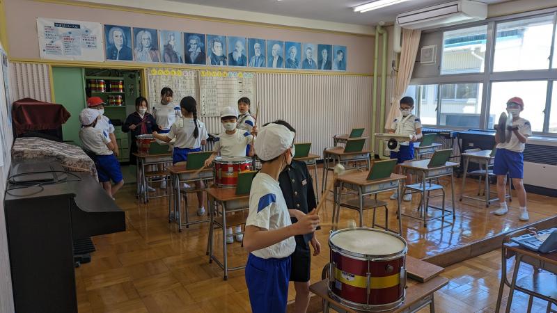 4〜6年生が昼休みに鼓笛練習に頑張っています。力強い演奏の音に、自然と低学年が音楽室の入り口に集まってきて応援しています。可愛いですね。