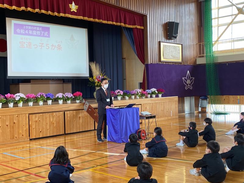 令和4年度の修了式が無事終了しました。宝達っ子5か条をもとに各学年の状況を振り返ったのち、1年から5年全員の修了及び進級を認定いたしました。