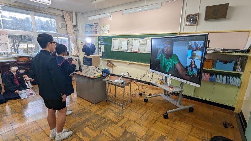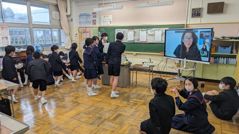 6年生が中米のジャマイカとインターネットで繋いで、現地の方とリモート交流を行いました。ALTのAmoyさんがJamaica出身で、Amoyさんの友人など知人3名の方にご協力いただきました。