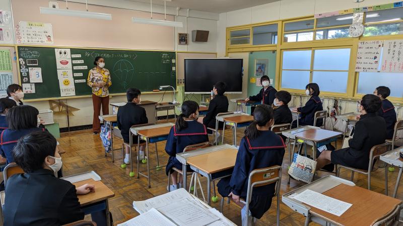 先日、ジャマイカとのリモート交流では、ALTのAmoyさんに大変お世話になりました。ありがとうございました。今日は、Amoyさんとの最後の授業です。身につけた英語でできるだけたくさんお話します。