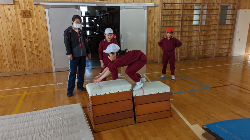 跳び箱を2列にして跳ぶ練習をしていました。開脚跳びの質を高める練習です。1年生はこの1年間でたくさんの事ができるようになりました。