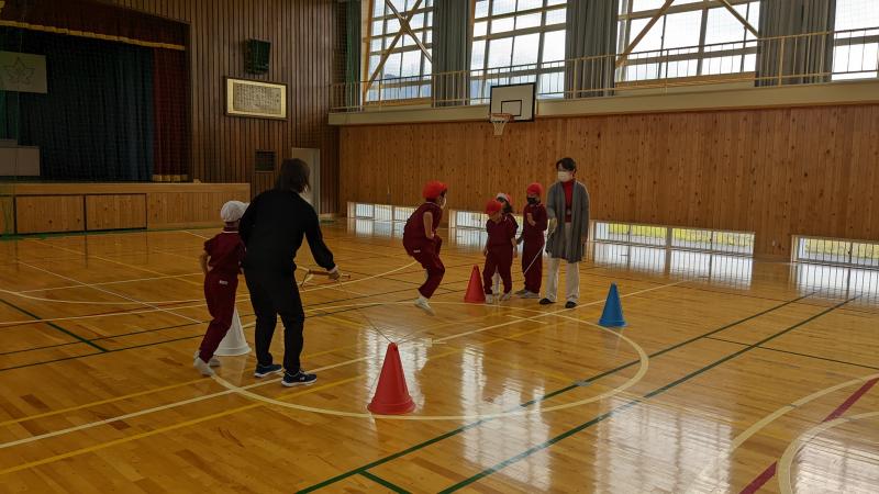 1年生が体育の時間に8の字跳びに挑戦していました。校務員の越野さんにもお手伝いしてきただきました。連続して跳ぶ練習に取り組んでいます。