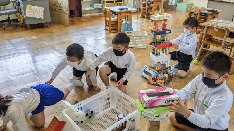 自宅にあった色々な容器を形の特徴によって仲間分けする学習をしています。容器を積み上げる活動でその特徴への理解を深めます。