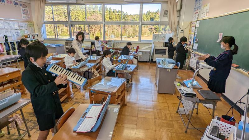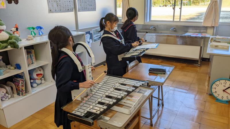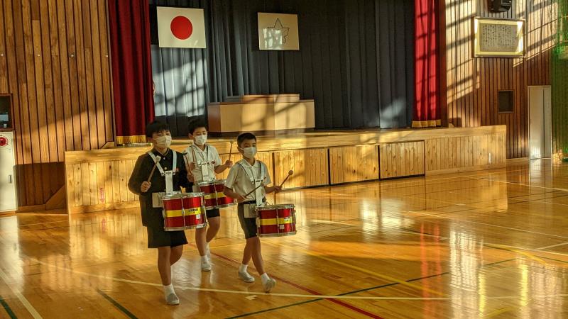 新宝達小鼓笛隊の活動が始まっています。昼休みなどを使って練習する様子が見られますが、この日は6限目に6年生も加わって強化練習がありました。