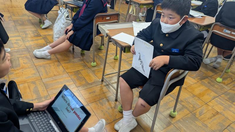 6年生は英語を学び始めて4年目になります。いろいろな言葉や表現に触れ、実際に使えるようになってきたものも増えてきたと思います。今日は、世界中のいろいろな動物の生息地や食べ物について紹介する活動に挑戦していました。どの子もとても上手に英語を使っていました。