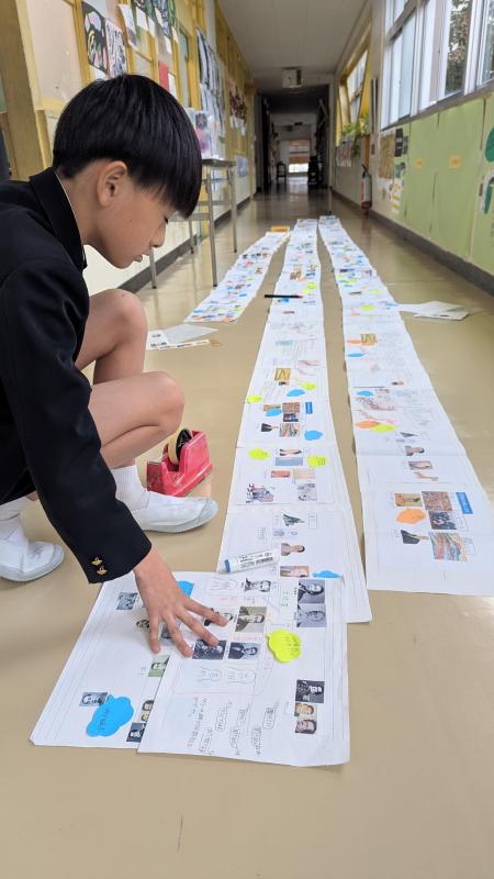 6年生が社会科の歴史の学習で、「絵巻物」作りをしています。縄文時代から始まって明治時代まで学習しましたが、それぞれの時代に活躍した人物や時代の特徴について「絵巻物」形式でまとめます。廊下に広げると、教室1つ分は超える長さになりました。
