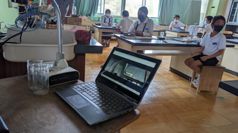 様々な理由で登校できない児童でも、体調が良い場合はリモートで授業を受けることができます。この日の4年生1名が、Chromebookを活用して、自宅と理科室を繋いで授業を受けることができました。