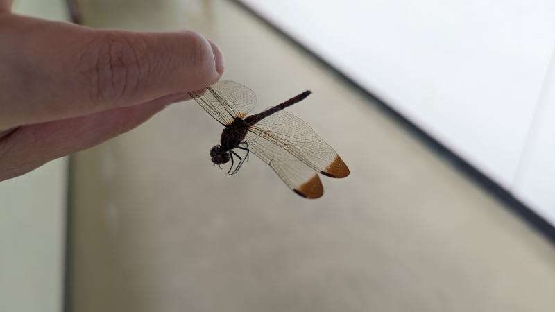 涼しくなってきて、トンボなどが学校に迷い込みます。さてこれは何というトンボ?赤トンボの仲間のようですが。