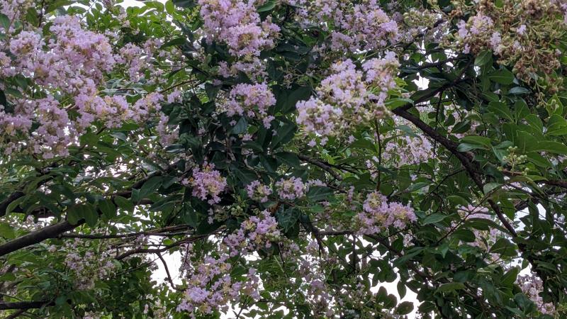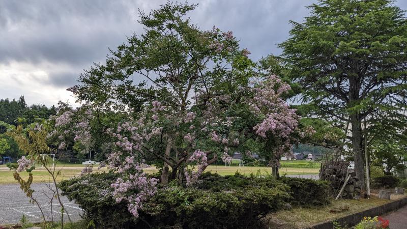 教室棟裏のサルスベリが満開です。サルスベリ(百日紅)の名のとおり、秋まで花を見ることができるようなので楽しみです。