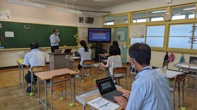 Chromebookを使った学習を2学期以降も取り入れていくため、学習ソフトの操作や授業場面での活用方法についての研修会を行いました。ICTサポーターの上田さんを講師にお招きし、ミライシードの協働学習ツール「ムーブノート」について指導を受けました。おすすめの都道府県を紹介する学習場面を想定し、日本地図の中にピンを刺したり、紹介文を入力したりします。その後、それぞれのワークシートを画面上に投影し交流します。