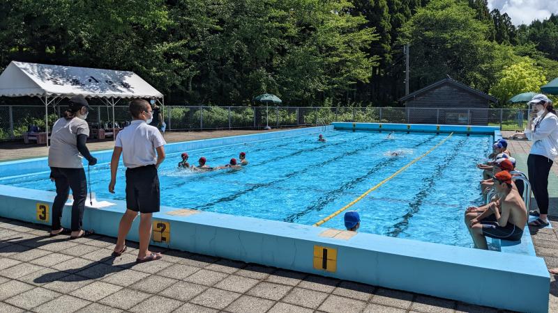 本日の全校登校日で、当初校内水泳記録会を予定していましたが、新型コロナウイルス感染症、熱中症警戒アラート、雷雨等の理由で、わずか2日しかプール開放の日がありませんでしたので、校内水泳記録会は実施しないことになりました。ただ、今日は天候が回復しましたので、各学年ごとに水泳学習を行いました。中には、記録をとる学年もありました。今年の記録会では、これまでの「用意」から「Take your marks(テイク ユア マークス).」に号令を変更して行う予定でしたので、今日もその号令が聞かれました。