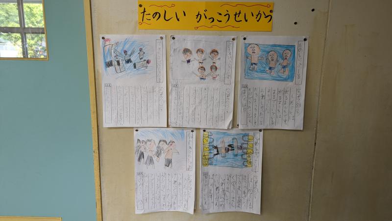 1年生の廊下掲示板に、国語や図工の作品が並んでいます。実物は通知簿渡しでご覧ください。