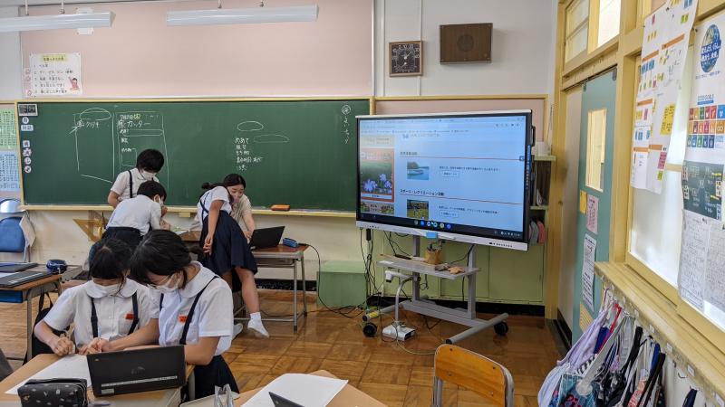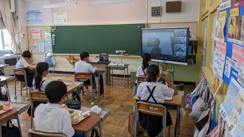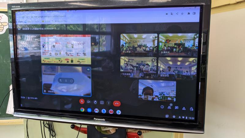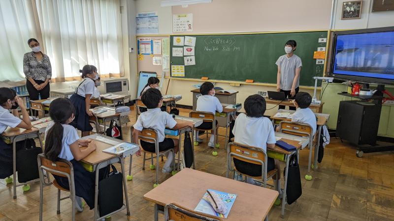 外国語活動で、ALTのAmoyさんと、時刻の表現の復習をしました。池島先生がインターネットでアメリカやジャマイカのライブ映像を流し、そこにある時刻を読み取り表現する学習でした。日本との時差にも子どもたちはびっくりしていました。