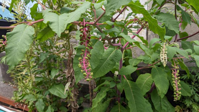 「ヨウシュヤマゴボウ」です。実や根に有毒成分が含まれています。食べると、腹痛、嘔吐、下痢、ひどい場合は死に至ることもあるそうです。子どもたちが触ると危険なので、明日伐採します。可愛らしい見た目に騙されてはいけませんね。