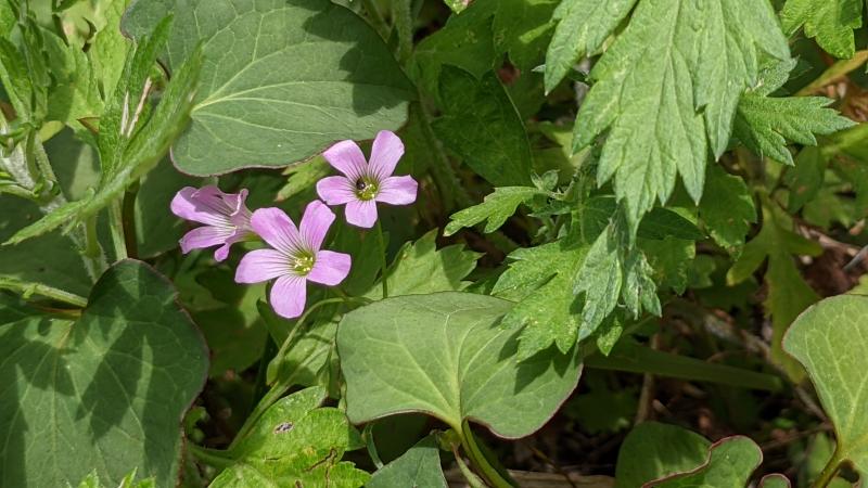 答えは、「ムラサキカタバミ」。こちらは食べられるようです。ただ、シュウ酸が多く含まれているので、注意が必要です。シュウ酸は、尿管結石などを作ることでも知られています。食べない方が無難ですね。