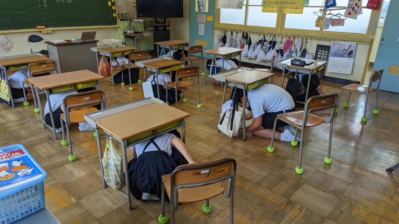 シェイクアウトいしかわ(石川県民一斉防災訓練)に参加しました。11:00の放送に合わせて、机の下に潜る、頭を守るなどの避難行動を取る練習ができました。