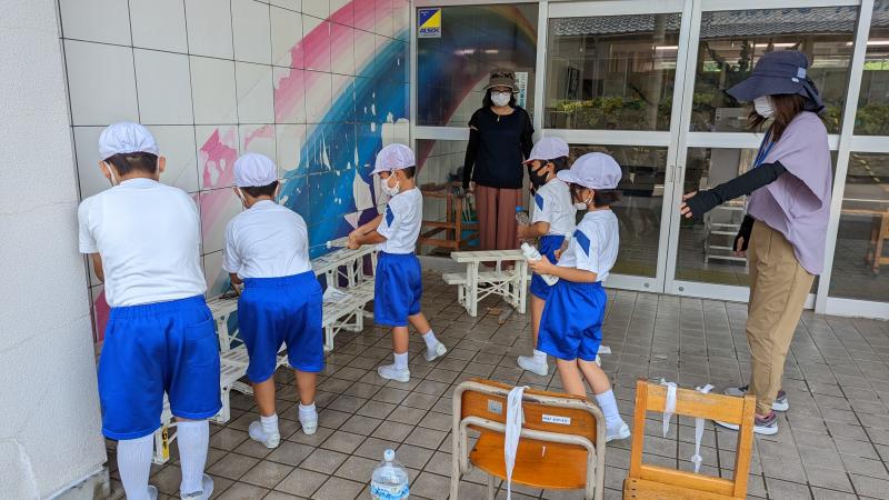 児童玄関で、1年生が生活科の学習で水遊びをして楽しみました。ペットボトルやマヨネーズの容器に水を詰め、まとめがけて噴射します。誰が一番上手に的に当てることができるかな?