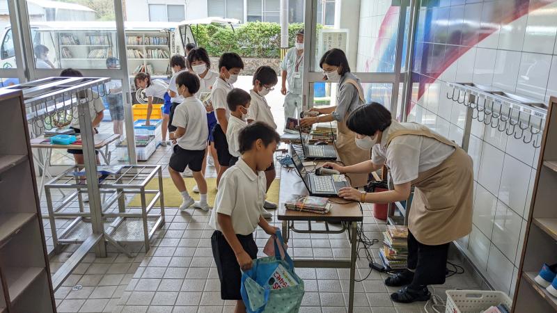 今日は「わかば号Ⅱ世」の来校日です。たくさんの子どもたちが借りに来ました。町立図書館の職員の方から、「こども読書マラソンカード」をいただきました。本を借りるたびにスタンプが貯まっていくようです。Ⅰ学期も残り少しですがどこまで貯められるかな?頑張ろう!!