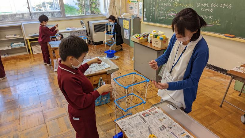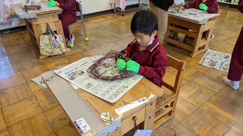 1年生が、春から夏にかけてお世話したアサガオのつるで、リース作りに取り組んでいます。切れないように丁寧につるを取り外し、リースの形に丸く上手に整えることができました。