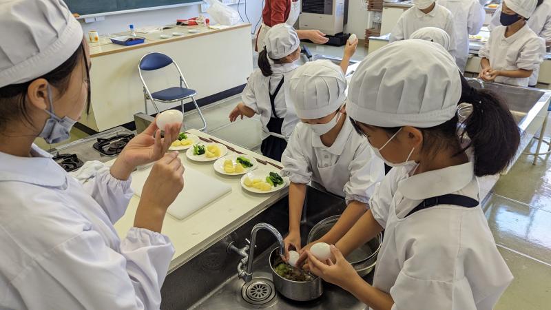 ブロッコリー、ジャガイモ、卵を使った朝ごはんづくりに挑戦しました。湯で時間を変えて、卵がどのように固まるかについても実験していました。