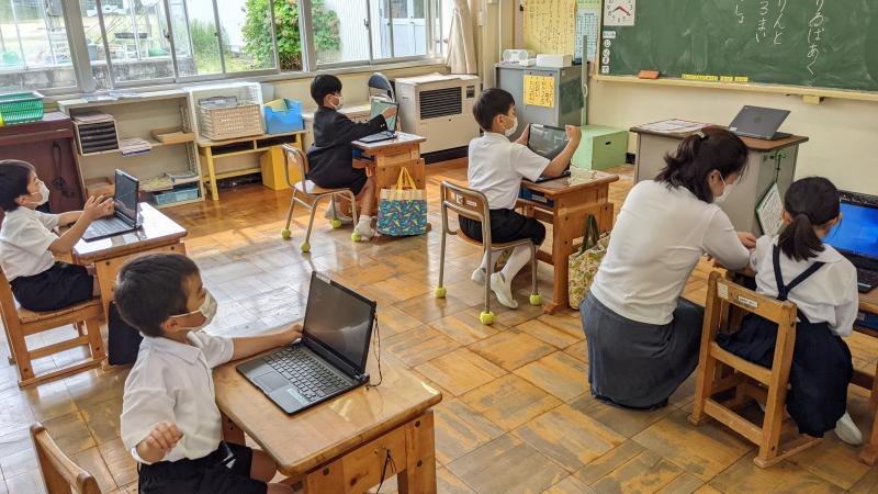 1年生もタブレット端末に挑戦しています。今はまだ、ログインにも時間がかかりますが、少しずつ学習に取り入れていきます。