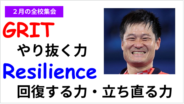 2月の校長先生のお話は、「GRIT(グリット、やり抜く力)」と「Resilience(レジリエンス、回復する力・立ち直る力)」についてでした。レジリエンスは、トレーニングで鍛えることができるのだそうです。元車いすテニスプレイヤーの国枝慎吾さんはレジリエンスを鍛えることでメンタル面が強くなり、ゴールデンスラムを達成しました。