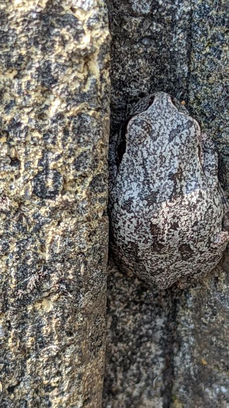 「アマガエル」の仲間ですね。周りのコンクリートの色に合わせて体色を変化させる「擬態」だと思われますが、「ハイイロアマガエル」という種があるようなので、同定はできませんでした。どなたか詳しい方、教えて下さい。連絡は学校まで。