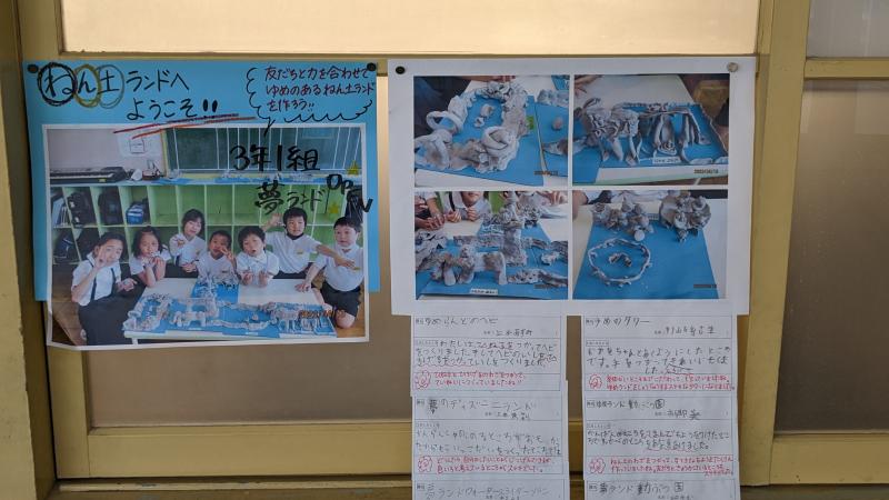 今年度最初の作品が完成しました。どれも力作です。作品といっしょにとった記念写真には、担任の先生からのコメントが入っています。今月末の授業参観でご覧ください。