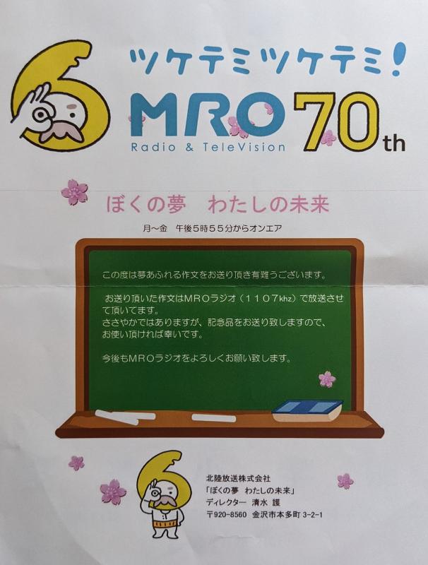 4〜6年生が取り組んだ「ぼくの夢 わたしの未来」の作文がMROラジオでオンエアされます。放送日は未定ですが、決まりましたらお知らせいたします。(7月から8月頃と思われます。)